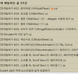 [맥 프로그램] cd음원 파일만들기 - X Lossless Decoder (XLD) X Lossless Decoder (XLD) is a tool for Mac OS X that is able to decode/convert/play various 'lossless' audio files. The supported audio files can be split into some tracks with cue sheet when decoding. 다운로드 : http://www.macupdate.com/app/mac/23430/x-lossless-decoder 설정은 multiple formats -> option -> mp3 설정 한뒤에 추출은 file - open audio cd - 시디 이름 클릭 하면 추출이 된다. 더보기 [아이폰] storyboard identifier Modal 방식 아래 것들로 해보다가 안되어 그냥 로그차원에 남겨둡니다. 보아 하니 tabbarcontroller에 view을 상속하고 있는거 같군요.. 하여튼 모르면 고생두세시간 만에 해결하여 기분이 좋습니다. !! UIStoryboard *sb = [UIStoryboard storyboardWithName:@"MainStoryboard_iPhone" bundle:nil]; UIViewController *vc = [sb instantiateViewControllerWithIdentifier:@"TabBarController"]; // tabbarcontroller ID값 (ID값은 stroyboard에서 설정함 - 아래 그림처럼 !) [self presentModalViewController:vc a.. 더보기 [아이폰] 블로그 강의 펌 http://blog.yagom.net/category/iOS%20Dev 더보기 이전 1 ··· 109 110 111 112 113 114 115 ··· 253 다음