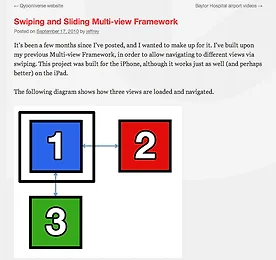 [아이폰] tableview cell 맨 앞 과 뒤에 추가 if ([gubunTemp isEqualToString:@"F2"]) { [messages insertObject:currentTitle atIndex:0]; }else{ [messages addObject:currentTitle]; } 더보기 [비밀] 페이스북이 쿨하게 1조에 산 Instagram의 아키텍처 보호되어 있는 글입니다. 더보기 [아이폰] multi view sliding and swiping Framework http://www.pushplay.net/2010/09/swiping-and-sliding-multi-view-framework/ 사진과 같이 오른쪽 아래로 이동을 할수 있도록 멀티뷰 프레임워크 참고 스와핑 뷰 튜터리얼 동영상http://vimeo.com/8930397http://vimeo.com/1450817http://www.bogotobogo.com/XcodeSDK-Chapter5.html 더보기 이전 1 ··· 76 77 78 79 80 81 82 ··· 253 다음